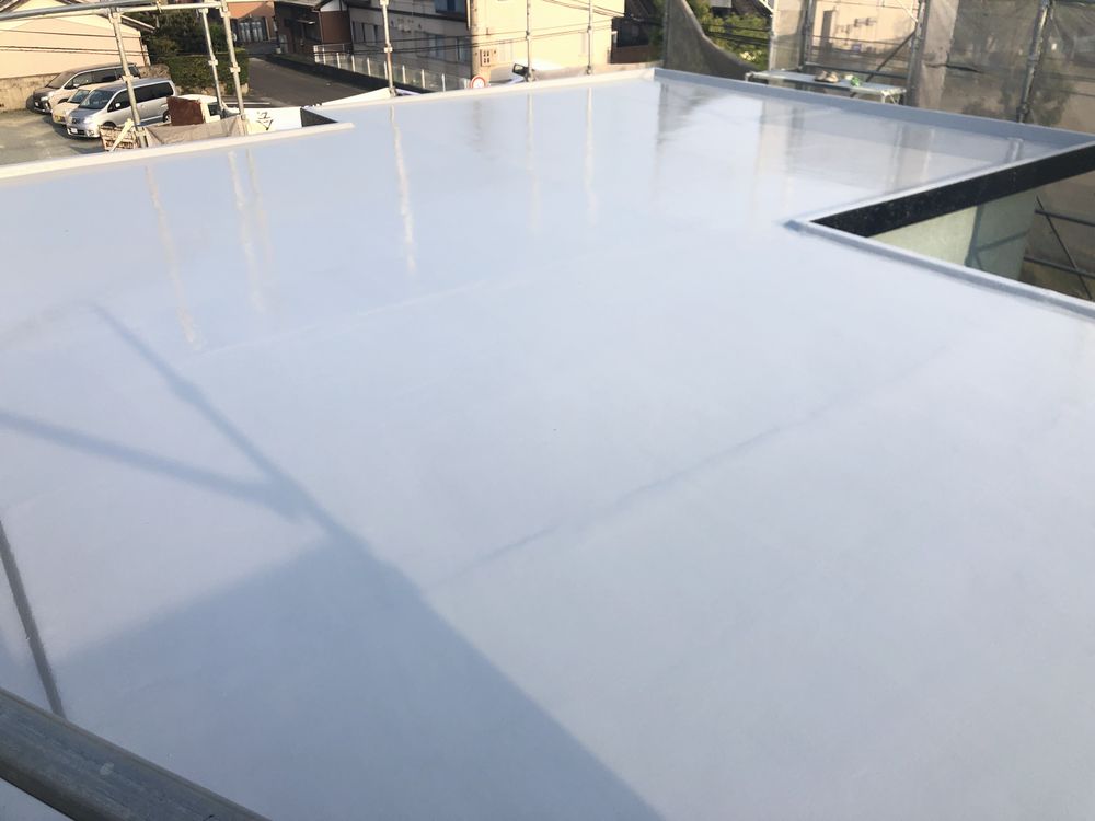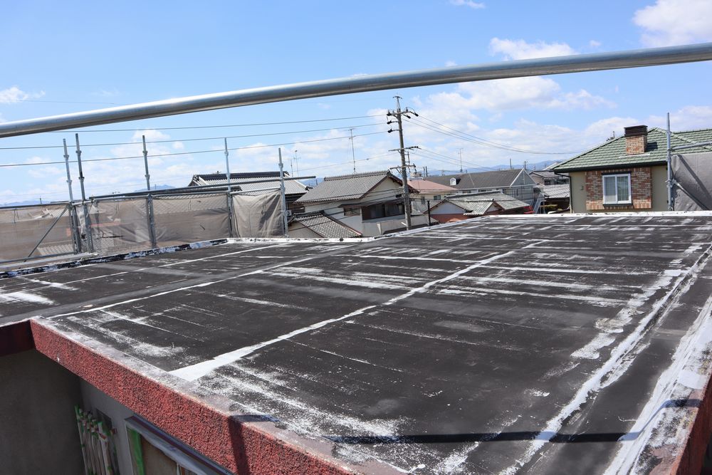 三重県津市のM様邸です。外壁塗装と一緒に御注文頂きました。既存の防水材との相性を見て水性塗膜防水を選定いたしました。プルーフロンアクアは柔軟性があり、建物(下地)に発生する伸縮・クラックに追従するため選定いたしました。また、塗膜が強靭で引張強度が高いため、長期にわたって防水層を維持いたします。 |