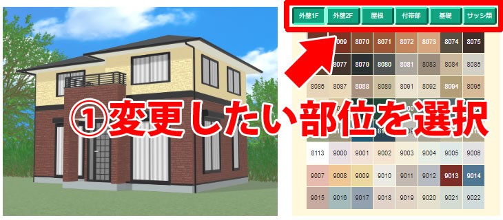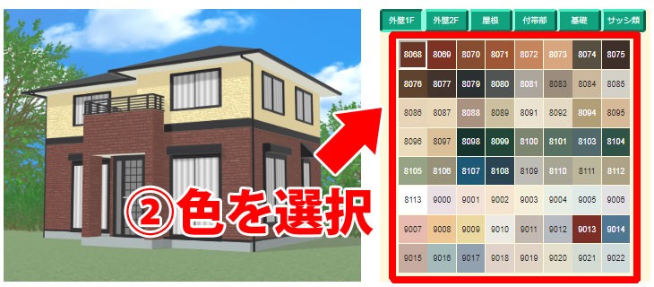 家のタイプ・部位を選びカラーパレットを押すだけで、