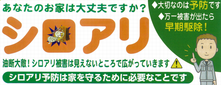シロアリQ&A Q,床下がコンクリートのベタ基礎ってシロアリはでないのですか? A,シロアリはコンクリートでも上がってきます。コンクリートの微かなヒビなどちょっとした隙間や配管の穴を利用して侵入してきます。こうした隙間も築年数が経つにつれて増えてきますのでシロアリ侵入のリスクも高くなってきます。現在、主流となっているベタ基礎の建物は「シロアリは出ない」と思われていますが、これは間違った認識ですので、ご注意してください。 Q,シロアリ消毒に適した時期っていつですか? A,特に適した時期はありません。気になった時がベストな時期です。シロアリは冬眠しない為、年中無休で活動しています。寒い時期は多少動きが鈍くなりますが、屋内に侵入したシロアリは着々と食べ進み被害が拡大していきます。 Q,シロアリの薬剤効果5年ってなんで? A,シロアリの薬も時代と共に変わっていきます。昔のように少々臭いがあっても効果が強い・長期間維持できる薬剤もありましたが、近年は人体への安全性と環境への配慮が重視され分解速度が速まっているため5年を限度とした優しいものが多くなっています。 |